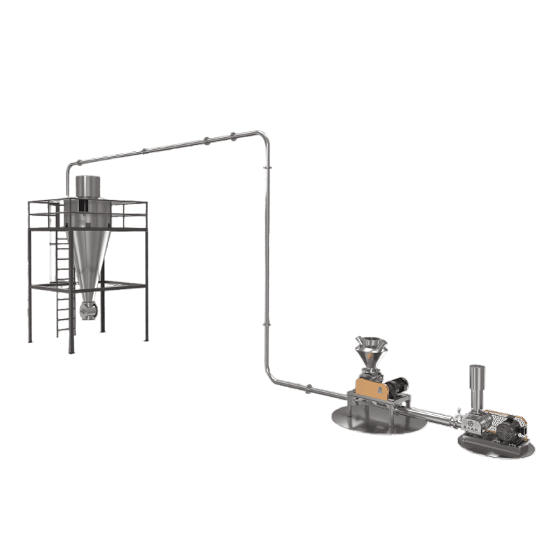 當(dāng)輸送管道內(nèi)氣體壓力低于大氣壓力時(shí),稱為吸送式氣力輸送即負(fù)壓輸送。當(dāng)風(fēng)機(jī)啟動(dòng)后,管道內(nèi)達(dá)到一定的真空度時(shí),大氣中的空氣便攜帶著物料由吸嘴進(jìn)入管道,并沿管道被輸送到卸料端的分離器。在分離器中,物料和空氣分離,分離出的物料由分離器底部卸出,而空氣通過(guò)除塵器除塵后經(jīng)風(fēng)機(jī)排放到大氣中。