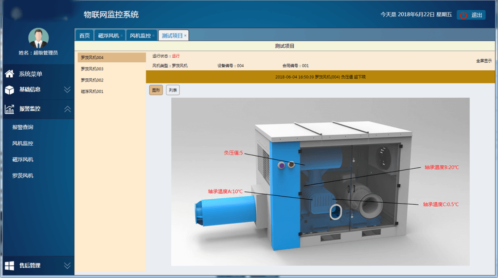羅茨風機本體上安裝有溫度傳感器、振動傳感器、噪聲傳感器等傳感設備,實時采集電機繞組和軸承溫度、羅茨風機振動及噪聲數據并上傳到控制柜。